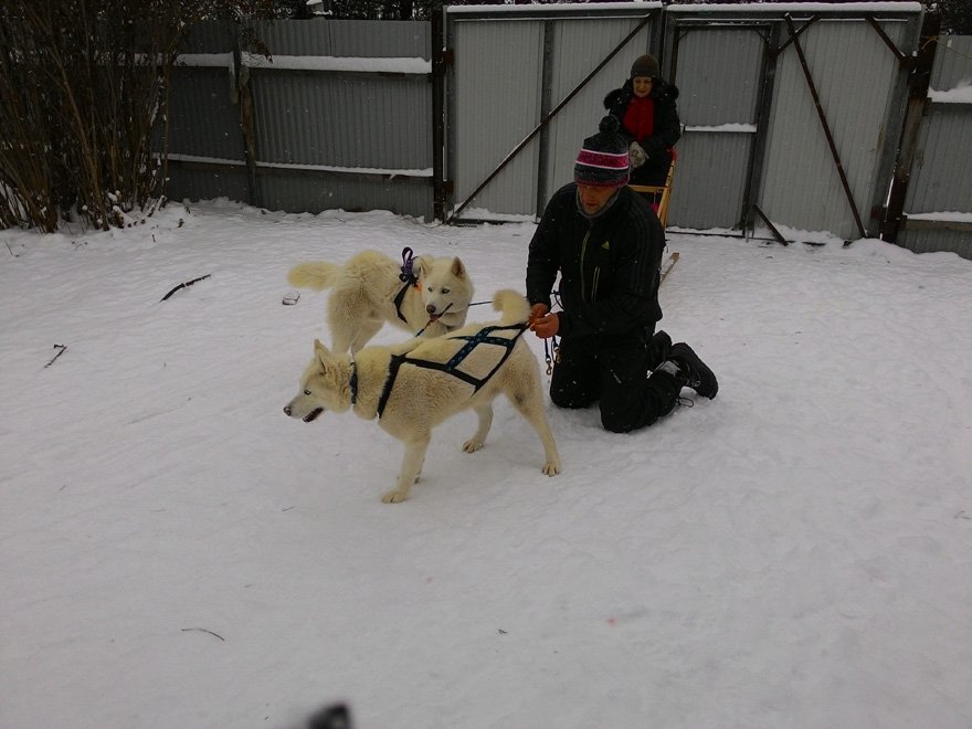 Quelques photos et nouvelles de Oleg et ses 4 Liubov. Les femelles Haurore et Hetoile ouvre la piste suivies des 2 mâles, Hanook et Igloo en wheel. Oleg vit aux portes de la Sibérie, dans une datcha en pleine nature, dans un village presque désert l'hiver, à 80 km de Perm. Des pistes magnifiques sur des centaines de km ... Le rêve pour un musher ! |